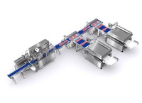 Автоматизированное упаковочное решение для промышленной резки мяса с двойной системой переноса в вакуумные камеры.