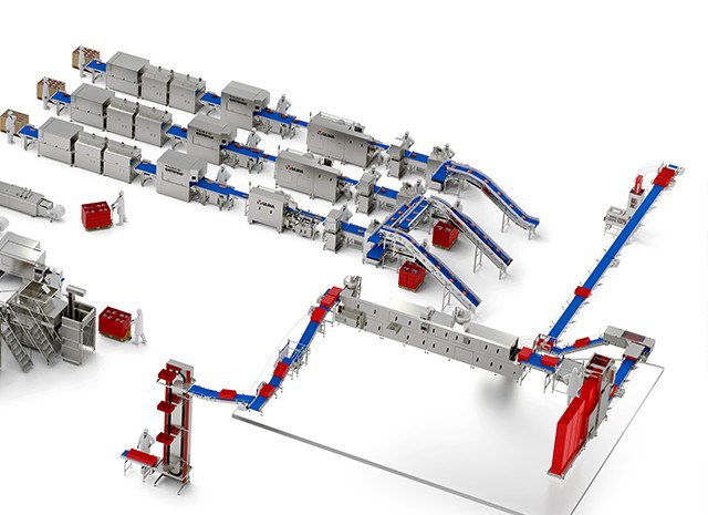Полная установка включает в себя оборудование для мытья пластиковых ящиков, используемых для транспортировки продукта в зону упаковки.