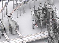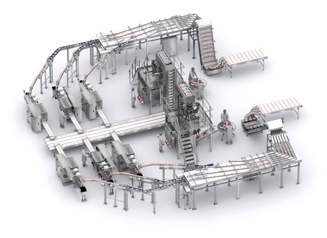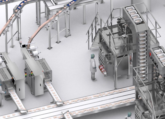 Упакованный продукт поступают на ленту, которая направляет упаковки на мультиголовочные весы, которые питают вертикальные упаковочные машины, осуществляющие упаковку продукта в мультипак.