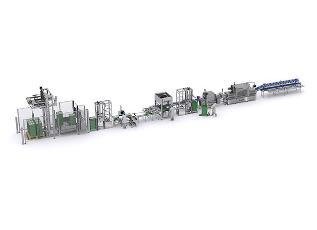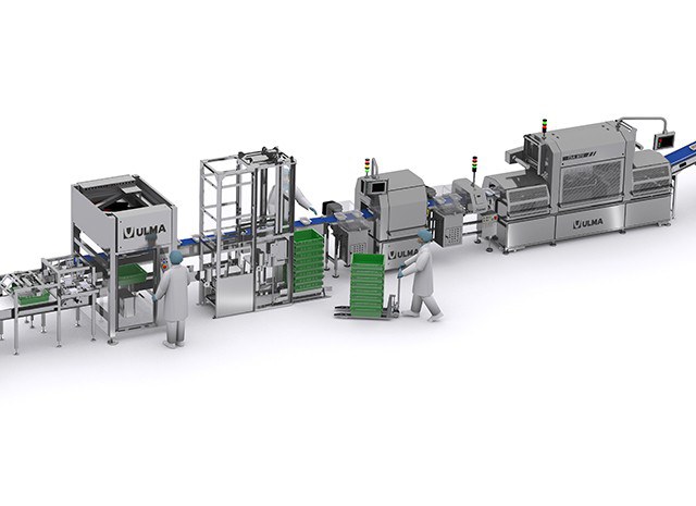 Зона подготовки продукта и загрузки в лотки оснащена различными лентами, которые обеспечивают операторов продуктом и лотками, которые передаются на трейсилер.