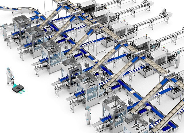 Каждая из семи линий оснащена роботами, которые формируют необходимую мозаику. Они поставляют короба, которые поступают через систему транспортировки и распределения.
