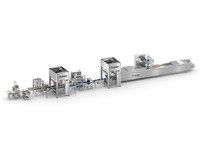 Полная линия полностью автоматизированной упаковки блоков сыра в мягкую упаковку на термоформовочной машине.