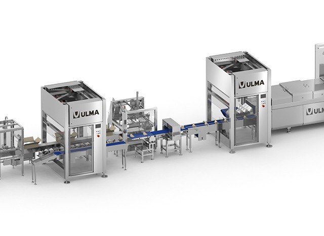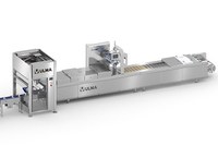 Упакованный продукт выходит из термоформера в три ряда, далее робот выравнивает по одному ряду на каждый цикл и поворачивает их перед размещением на ленте.