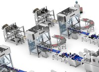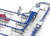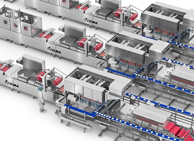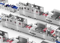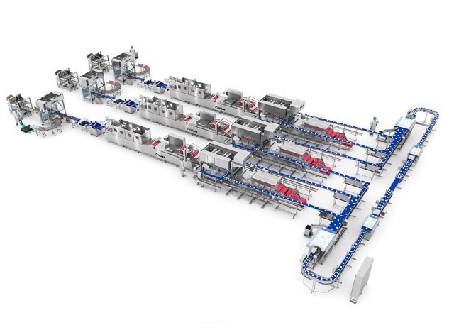 Посредством конвейерной системы, предназначенной для свежих продуктов и облегчающей очистку, продукт делится на две части, которые сбалансированно распределяют продукт по термоформовочным машинам.