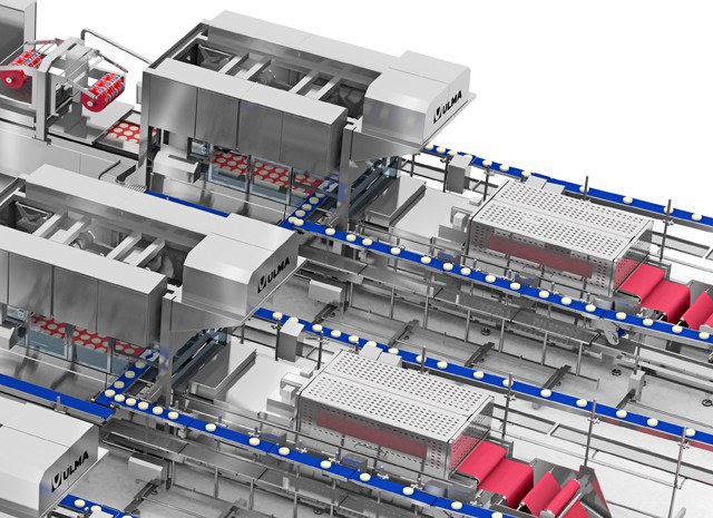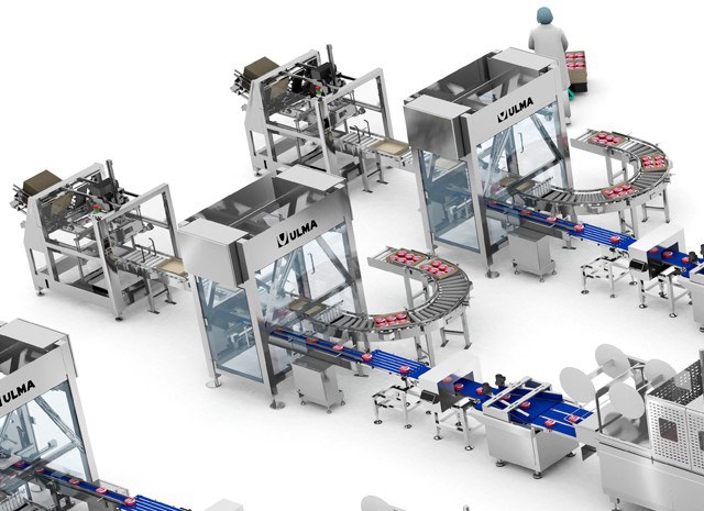 На каждой из трех линий есть сборщик, который формирует картонные короба. Робот отвечает за размещение лотков в короба, располагая их в соответствии с заранее определенной мозаикой.