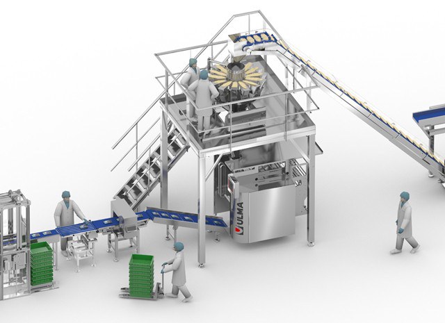 Продукт поднимается до комбинированной мультиголовки, которая распределяет необходимое количество сыра в каждую упаковку.