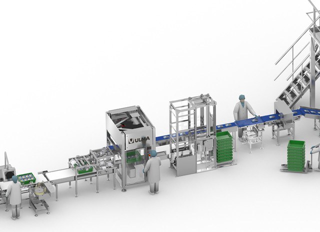 На роботизированную систему укладок в короба с одной стороны поступает продукт, а с другой – пустые пластиковые ящики. Робот упаковывает продукт в короба, формируя мозаику в соответствии с размерами пакетов с сыром и требованиями заказчика.