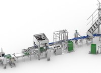 Сразу после формированием коробов и перед укладкой их в пластиковые ящики, этикетировщик, встроенный в линию, наносит этикетку на каждый из них.