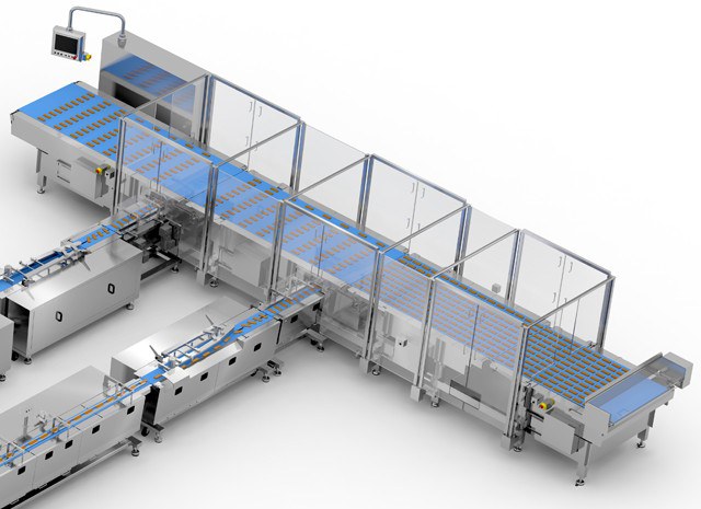 Многолинейная система подачи выполняет выравнивание батончиков для первичной упаковки и обеспечивает их точное разделение для максимизации потока и производства упаковки.