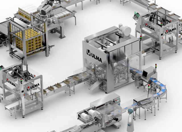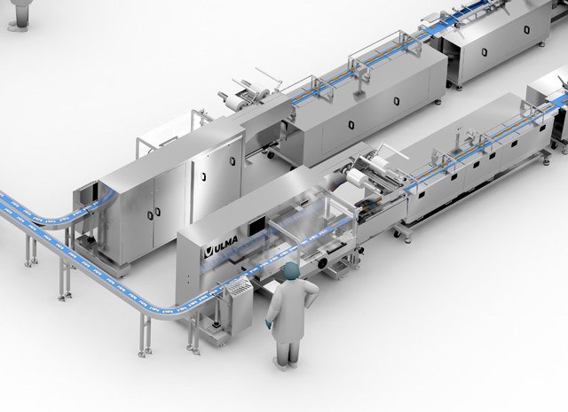 Полная линия для упаковки шоколадных батончиков, которая включает в себя первичную и групповую упаковку, а также упаковку в короба.