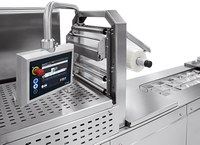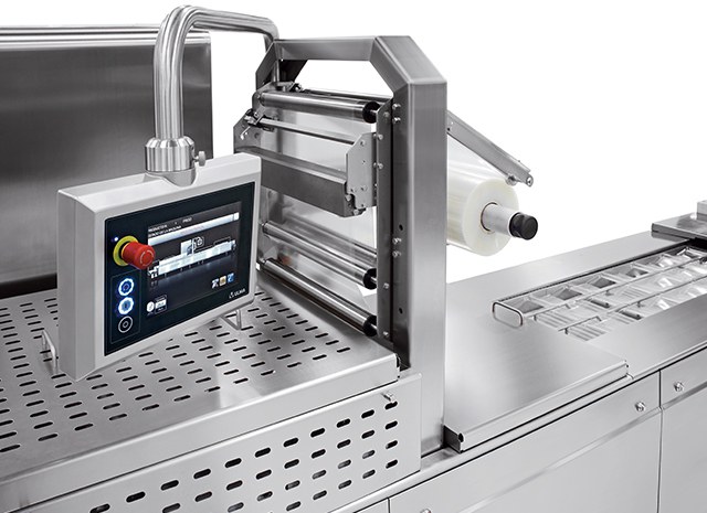 Термоформер в гигиеничном исполнении для упаковки в мягкую и в жёсткую плёнку с опциями упаковки в МГС и вакуумирования. Средний уровень производительности.